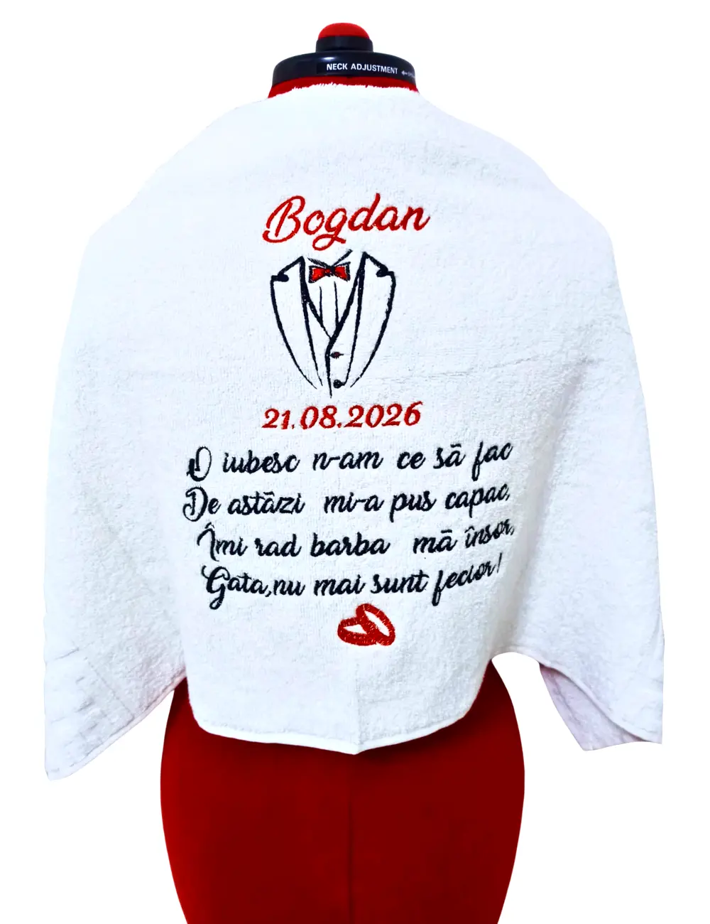 Prosop personalizat pentru barbati, cadoul ideal pentru traditia „barbieritul mirelui”! Cu designul sau traditional si atentia la detalii, acest prosop va adauga o nota de eleganta si rafinament ritualului din ziua nuntii!