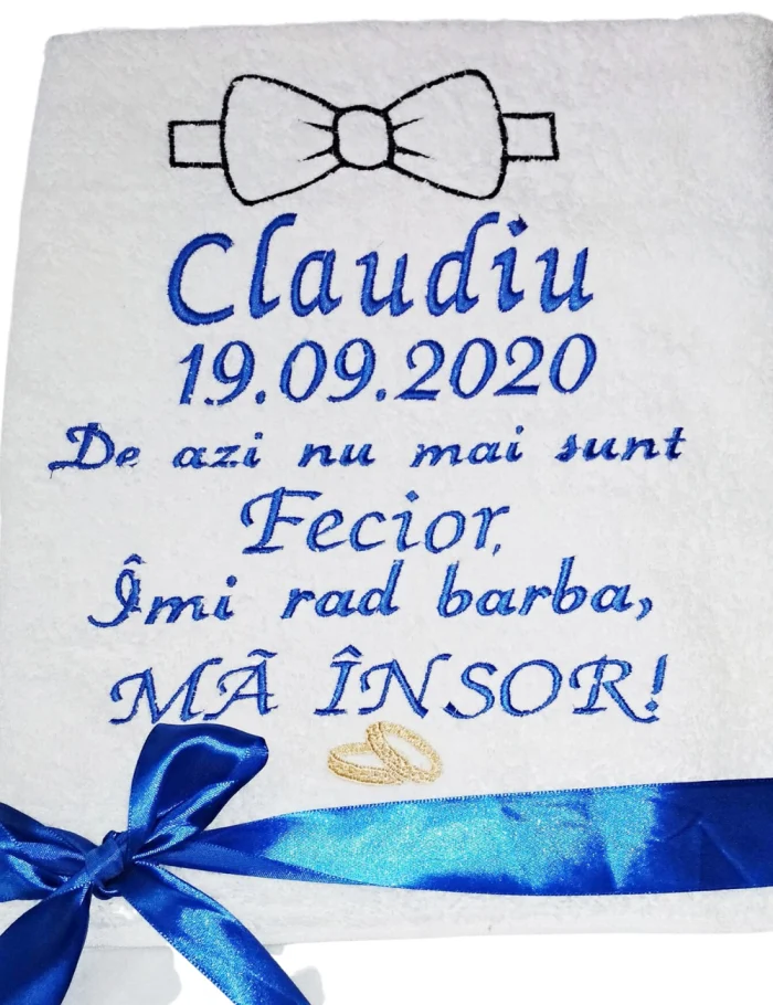 Prosop personalizat pentru barbati, cadoul ideal pentru traditia „barbieritul mirelui”! Cu designul sau traditional si atentia la detalii, acest prosop va adauga o nota de eleganta si rafinament ritualului din ziua nuntii!